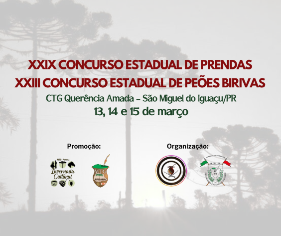 Vem aí o XXIX Concurso Estadual de Prendas e XXIII Concurso Estadual de Peões Birivas do Movimento Tradicionalista Gaúcho do Paraná!